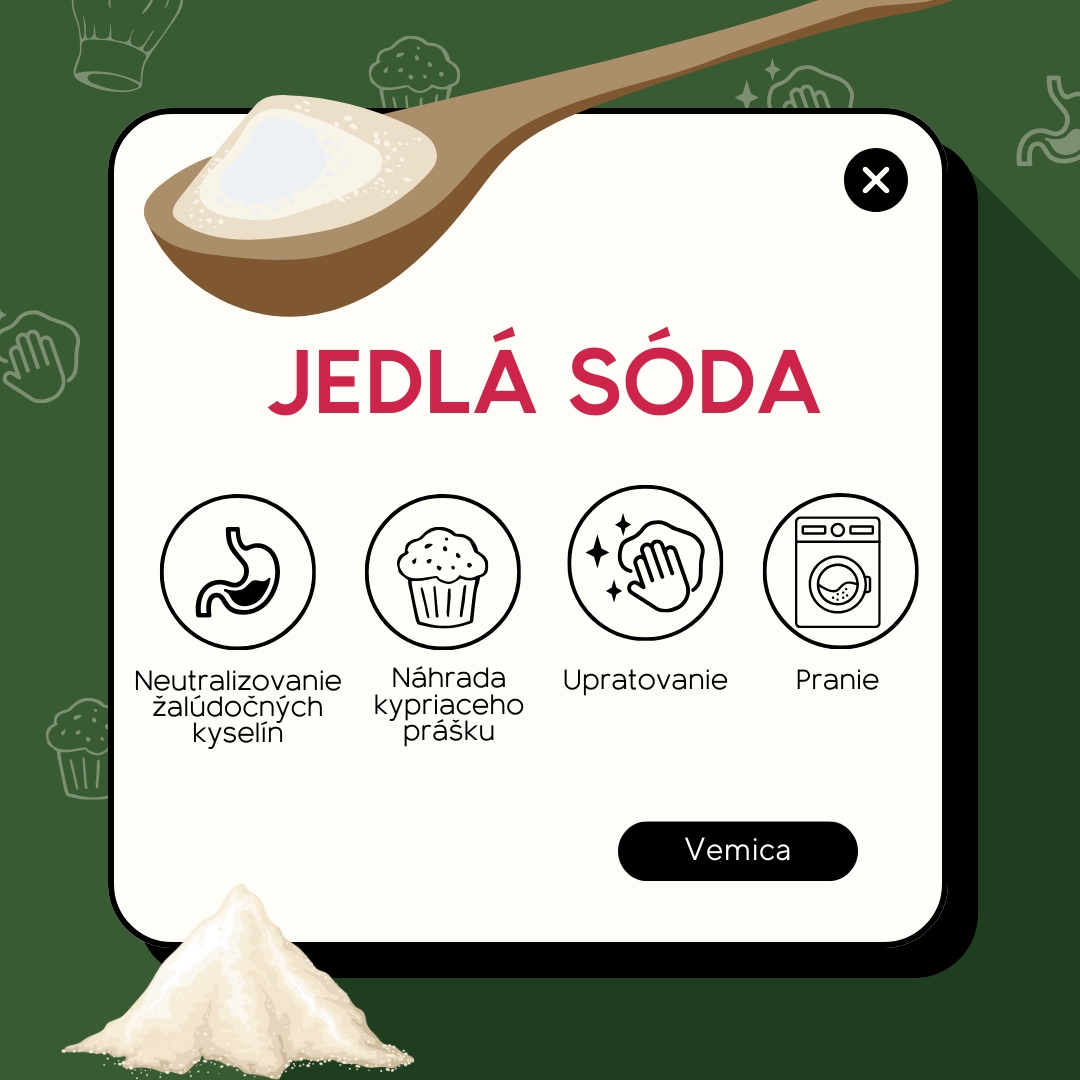 Zloženie: Jedlá sóda (Hydrogén uhličitan sodný NaHCO3)