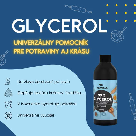 Glycerol 99,5% bezfarebná, viskózna kvapalina, bez zápachu, sladkej chuti určená pre potravinárstvo, domácnosť a kozmetický priemysel.